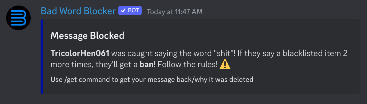 When a message is blocked, Bad Word Blocker sends an embed (unless you have it disabled with the "self destruct counter" option).