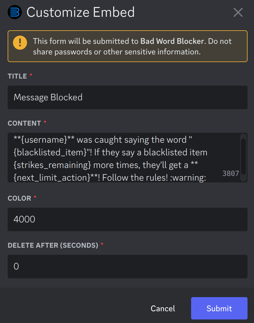 * `{content}` - The contents of the deleted message. If you put a word in parathesis after the word `content`, then every usage of a blacklisted item will be replaced with that word. For example, if you put `{content(cheese)}`, then every blacklisted item will be replaced with the word “cheese”.